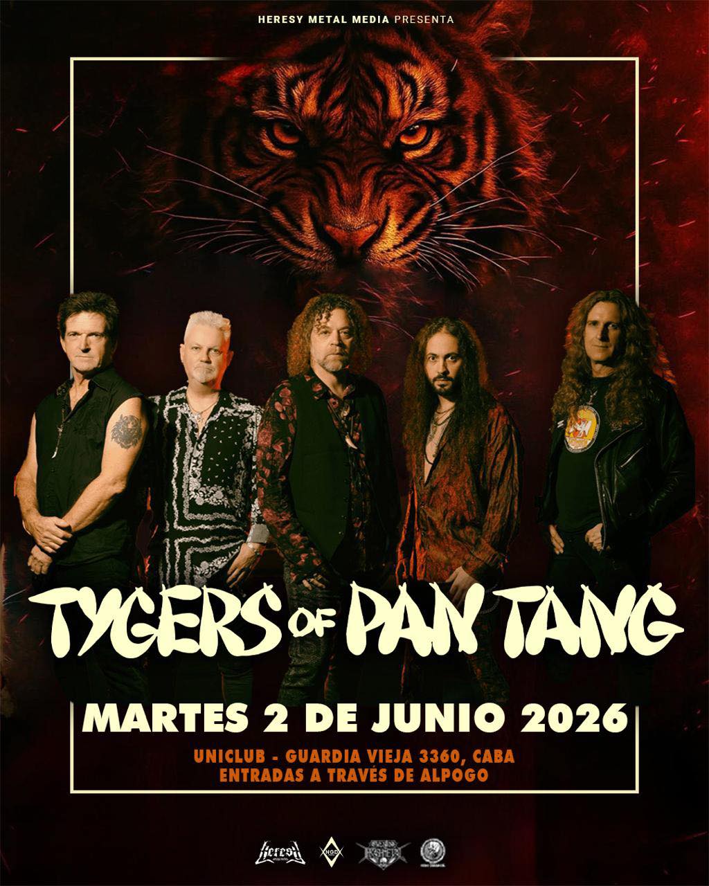 La legendaria banda de Heavy Metal británico, TYGERS OF PAN TANG, anuncio su gira por Latinoamérica llamada “South America Roar 2026”, dicha gira tiene a presentaciones confirmadas en Argentina, Brasil, Paraguay, Chile, Perú, Ecuador, Colombia. Para el show en Buenos Aires, esta pautado para el martes 2 de Junio del 2026 en Uniclub – Guardia Vieja 3360 (CABA). Las entradas se encuentran disponibles a través de la web Alpogo.com