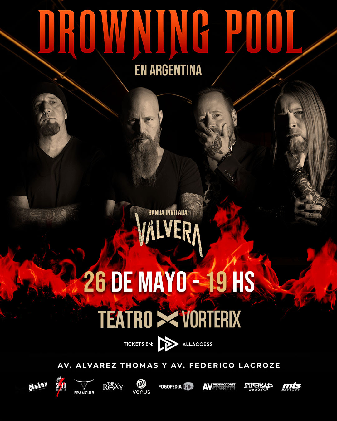 La banda estadounidense de Nu Metal, Drowning Pool, llega por primera vez a Argentina en el marco de su gira “South American 2026” que los traerá a Colombia, Perú, Chile y Brasil. Su primera y única presentación en Buenos Aires, será el martes 26 de mayo – 19hs en el Teatro Vorterix – Av. Álvarez Thomas y Av. Federico Lacroze (C.A.B.A). Las entradas se encuentran disponibles a través de la web ALLACCESS