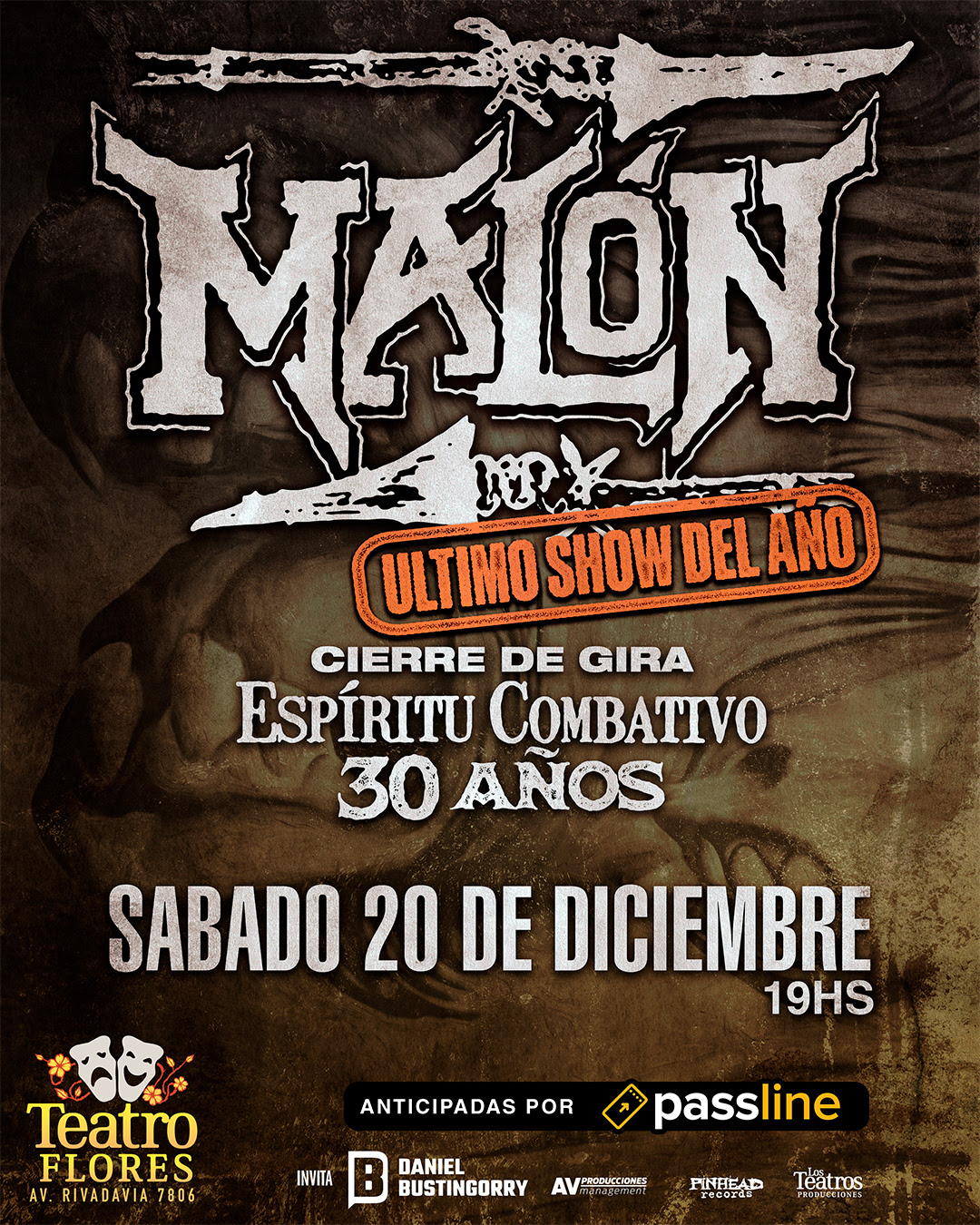 La banda argentina Malón, cierra su gira por el 30 aniversario de su primer álbum ¨Espíritu Combativo¨ (1995) con un único show el 20 de Diciembre en el Teatro Flores – Av. Rivadavia 7806 (C.A.B.A). El show contará con un set list donde tocarán el disco en su totalidad y además de recorrer su discografía. Este será el último show de la gira conmemorativa los llevó por toda la Argentina y varios países de Latinoamérica y España. Entradas a la venta por sistema Passline.
