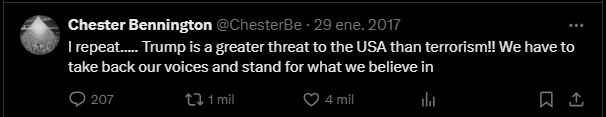 El difunto Chester Bennington, ya había expresado su rechazo hacia el presidente Trump, en Enero de 2017 publicó un Tweet en el que decía “Repito… ¡Trump es una amenaza mayor para Estados Unidos que el terrorismo! Tenemos que recuperar nuestras voces y defender lo que creemos.” Este tipo de declaraciones, justifican el malestar de los fans, así como la petición de la banda de no usar la música de Linkin Park con fines políticos y sin autorización.
