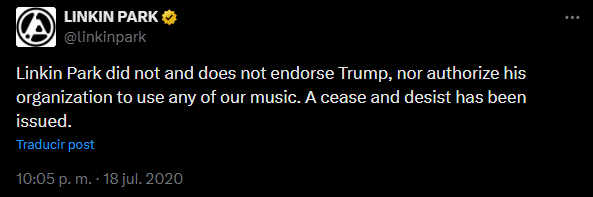 Esta no es la primera vez que ocurre algo así. En 2020, Linkin Park emitió una orden de cese y desistimiento y la hizo pública en su cuenta de ‘X’ (antes Twitter) después de que Donald Trump usara su música en un video de campaña. La banda siempre ha sido clara: “No usen nuestra música con fines políticos sin permiso”. Sus fans han apoyado constantemente esta postura, especialmente porque las canciones de la banda tienen un profundo significado personal.