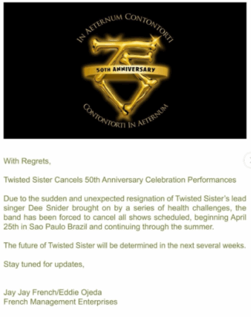 Según un comunicado oficial difundido el 5 de febrero de 2026 por los guitarristas Jay Jay French y Eddie Ojeda, las presentaciones previstas a partir del 25 de abril en São Paulo, Brasil y continuando por festivales y fechas de verano en Europa y América del Norte han sido suspendidas. La banda explicó que la renuncia de Snider fue “repentina e inesperada” y consecuencia de una serie de desafíos de salud que hacen imposible continuar con la gira en las condiciones planeadas.