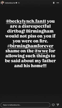 “Becky Lynch, eres una basura irrespetuosa. ¡Birmingham no orinaría sobre ti ni aunque estuvieras en llamas! Vergüenza para la WWE por permitir que se digan esas cosas sobre mi padre y su hogar”, escribió, acompañado del hashtag #BirminghamForever.