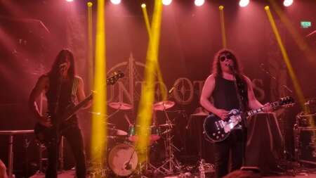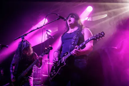 GF: ‘No sé si soy un barítono, podrías estar cerca, estoy un poco por encima de un barítono, creo que sería un tenor o algo así. Pero sí, cuando comenzamos la banda era como “¿cómo conseguís tu estilo?”. Intentamos ser Góticos, al principio. Aún hasta hoy, decir que queremos ser Góticos suena un poco tonto, porque el Gótico no es tanto un género, es más bien un estilo. La razón por la que sonamos góticos fue porque yo no podía cantar alto. Todas las bandas que yo escucho suenan alto. Las bandas del BWOBHM suenan.. todo el tiempo, cosas como Enforcer, Skull Fist. Me encantan todas ellas, por supuesto, pero yo no podía hacer eso y si trataba de forzarlo, sabía que no sería mi voz natural y sabía que tenía que ser auténtico con cualquier voz que tuviera, usar las herramientas que se me dieron al nivel más alto posible. Y sabía que era más cómodo para mí cantar en el rango medio-bajo. Eso era lo que me importaba’.