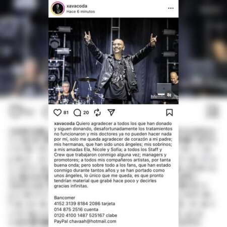 “Quiero agradecer a todos los que han donado y siguen donando, desafortunadamente los tratamientos no funcionaron y mis doctores ya no pueden hacer nada por mí, solo me queda agradecer de corazón a mi padre; mis hermanas, que han sido unos ángeles; mis sobrinos; a mis amadas Ela, Nicole y Sofia; a todos los Staff y Crew que trabajaron conmigo alguna vez; managers y promotores; a todos mis compañeros artistas, por tanta buena onda”.